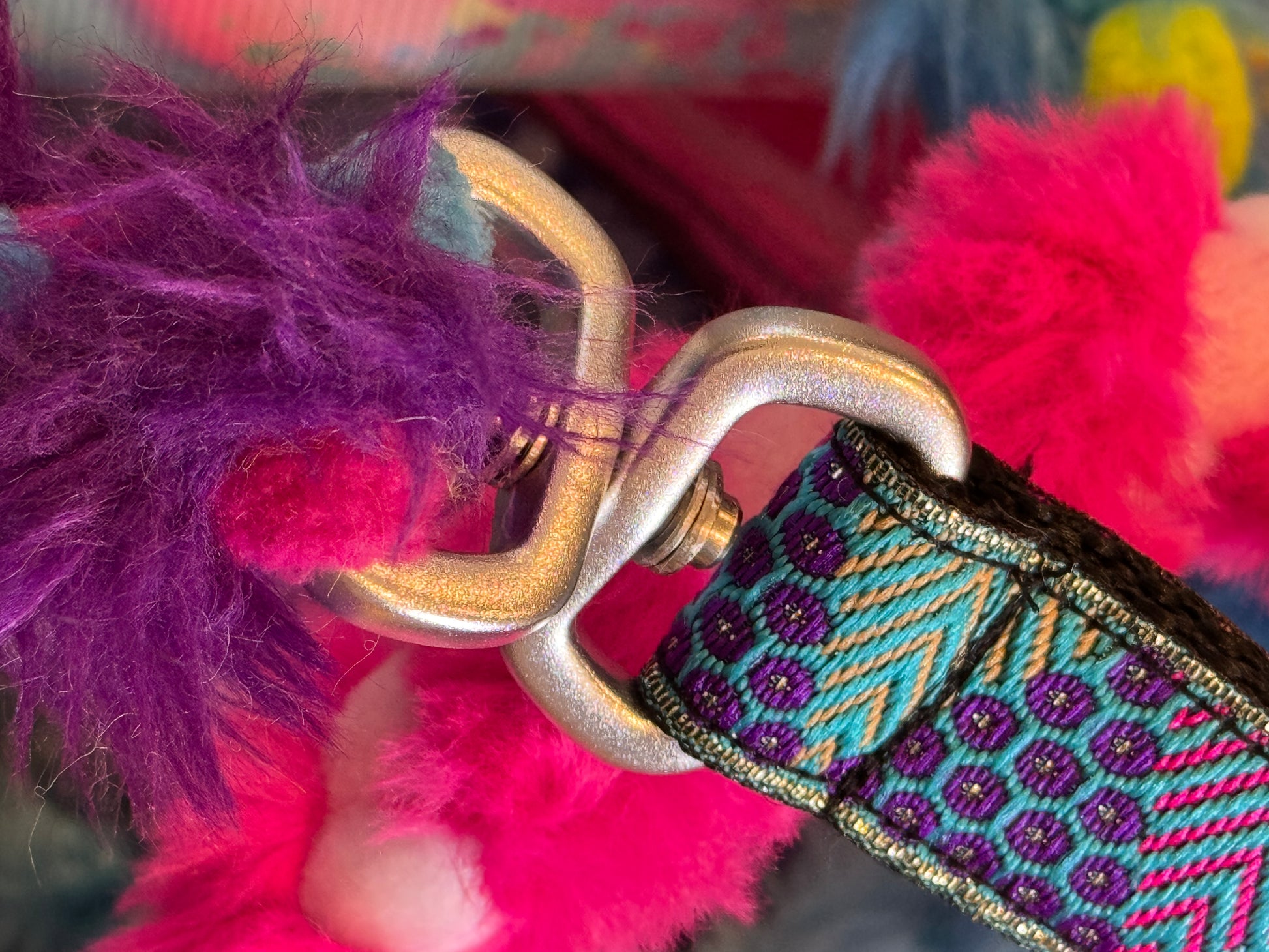 The collar has approx. 4cm of adjustment with a triglide, so if you are an in-between size or your pup grows your lead will last the distance. The collar is made of either 25mm Lead On exclusive webbings or ribbon stitched onto 25mm webbing. The webbing is backed with polar fleece and then this is backed with a soft fur. Hardware at this stage is either silver or brass. Collars can be made in Small/Medium/Large sizes. XSmall could be a possibility once I play with the thinner webbing/ribbon.