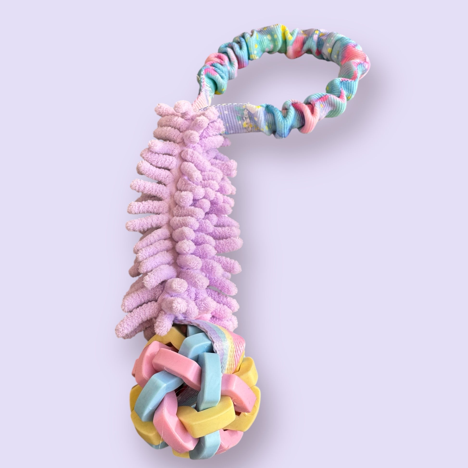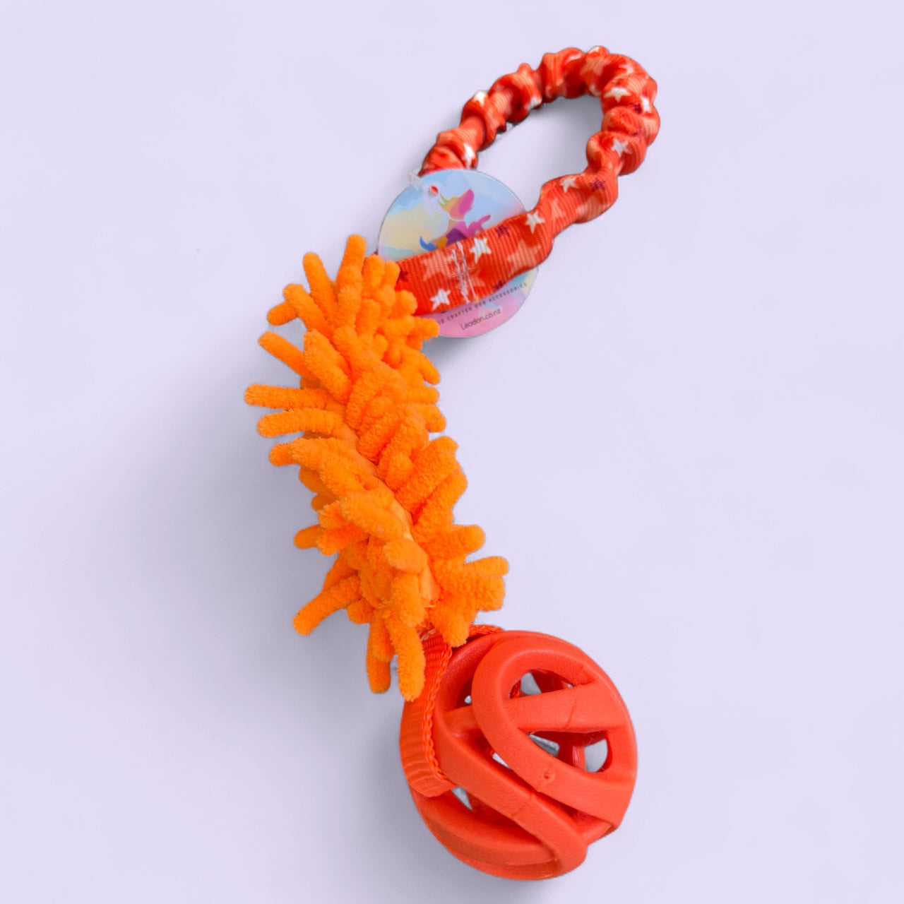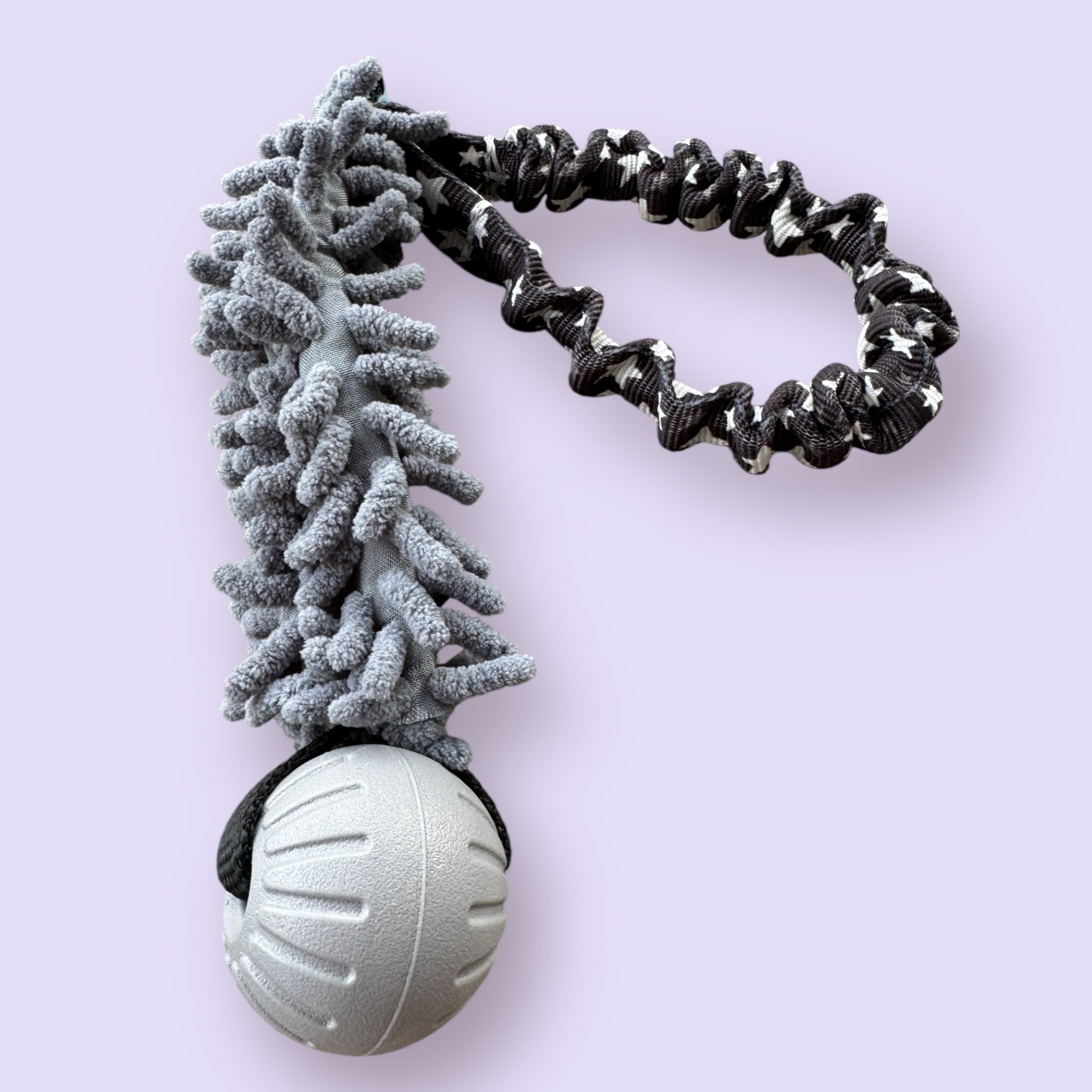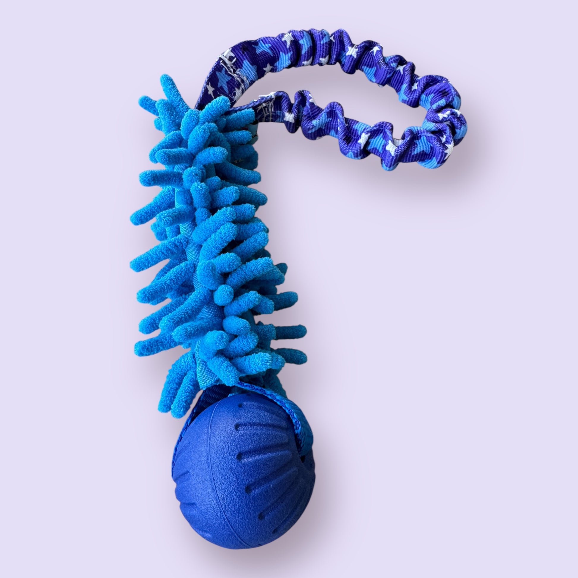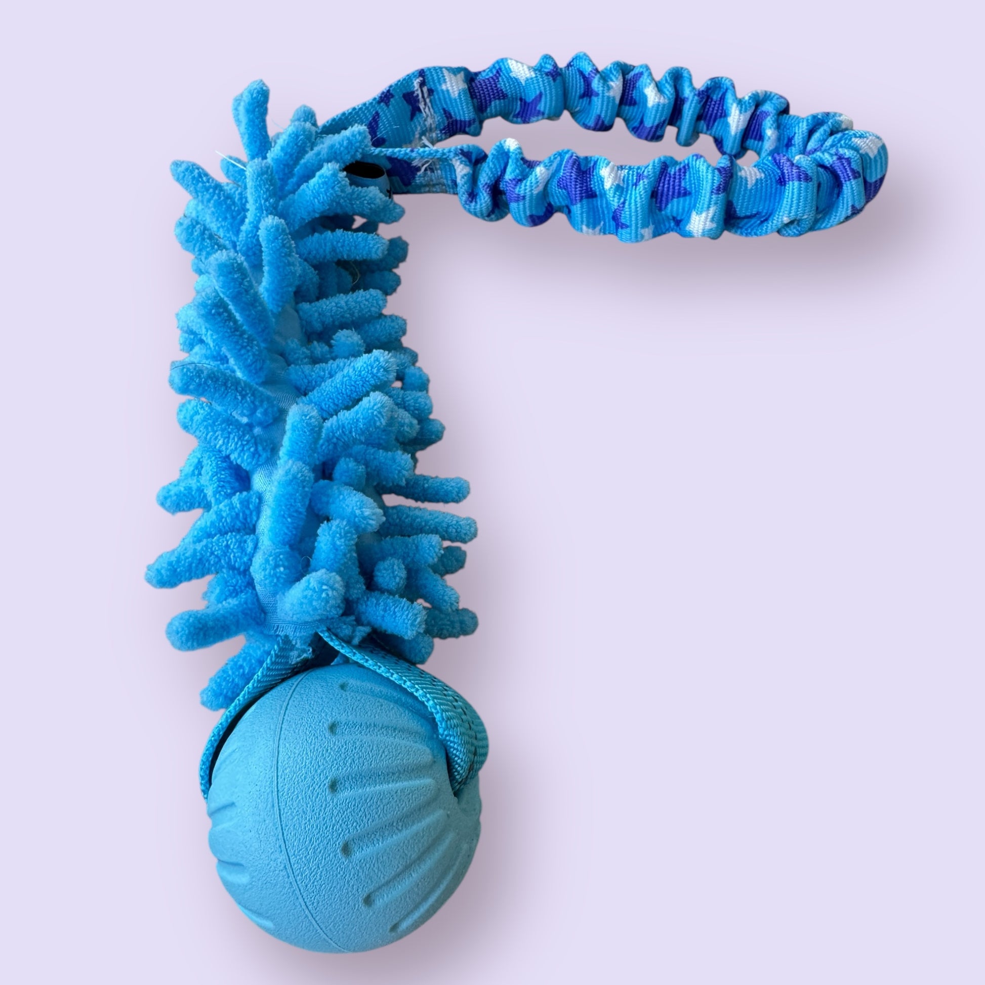 These toys have a Short Bungee Handle with various ball attachments. Between the ball and the bungee handle is a mop bite bar of approx. 15cm.