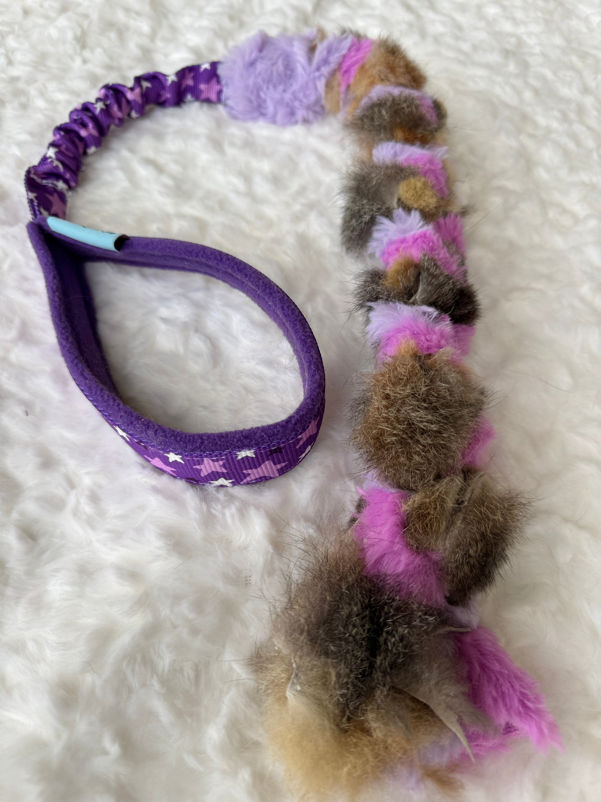The Bungee Rabbit or Possum Fur Braided Tug is approx. 80cm long. The rabbit fur section is approximately 40cm
