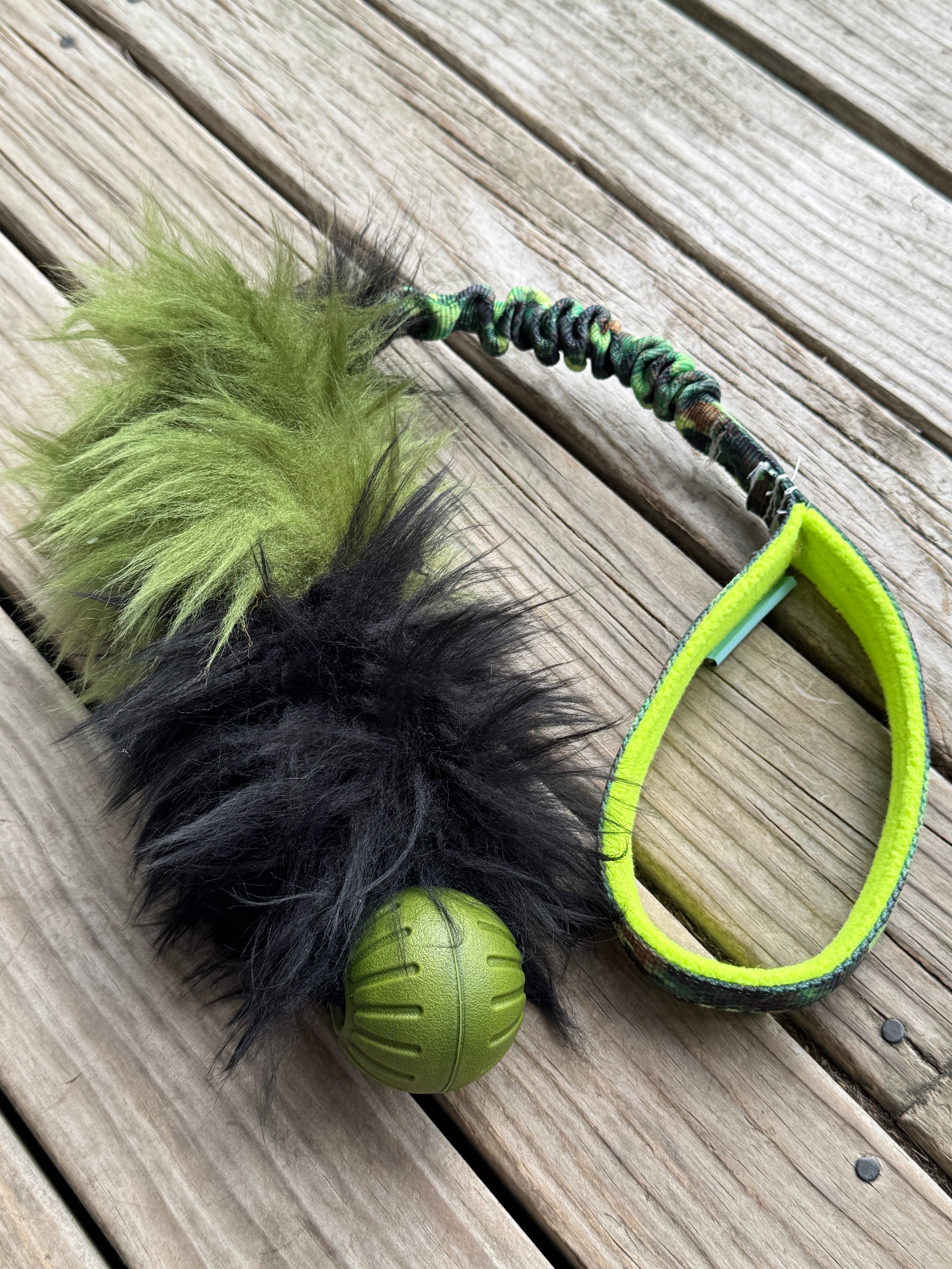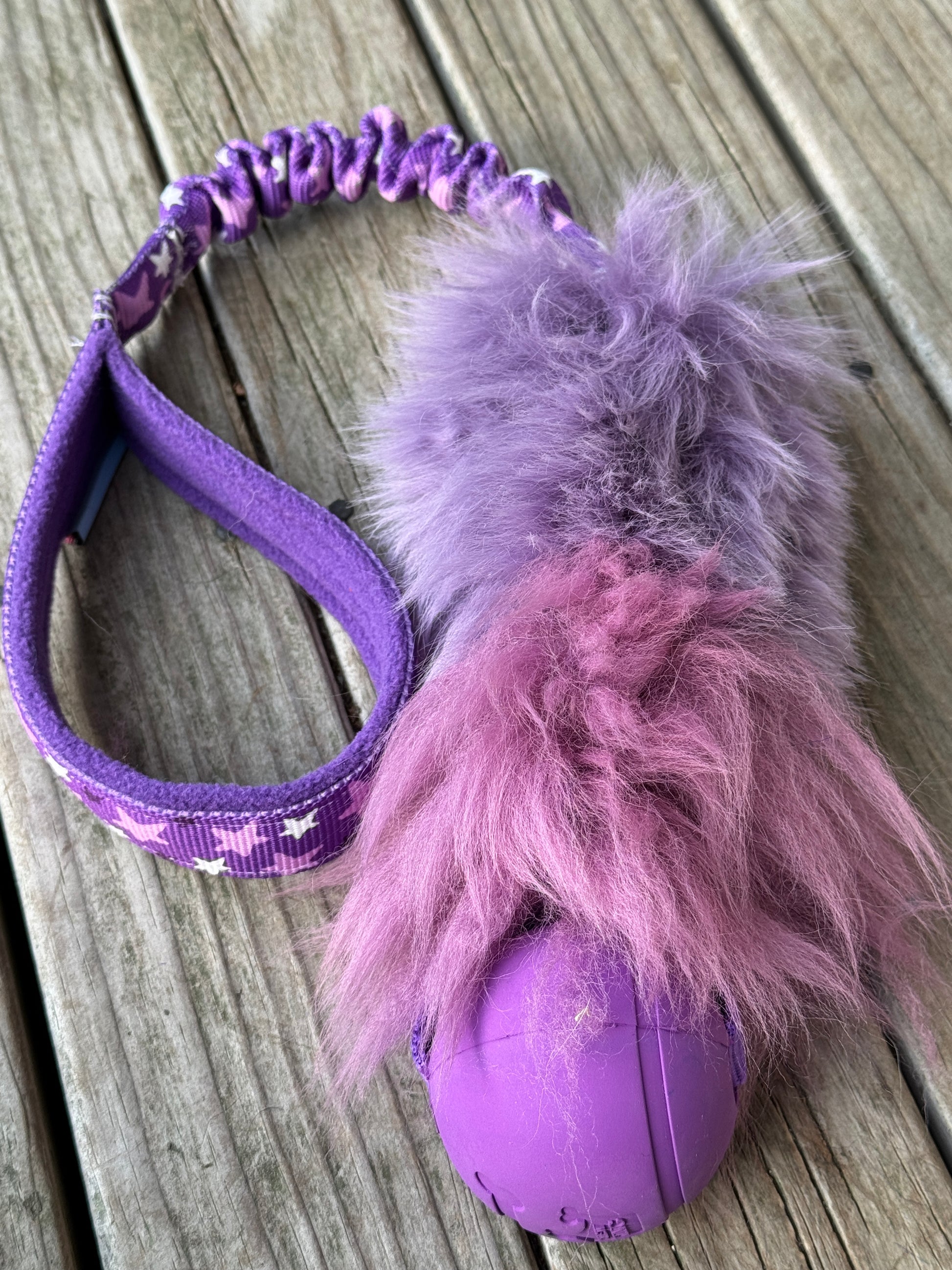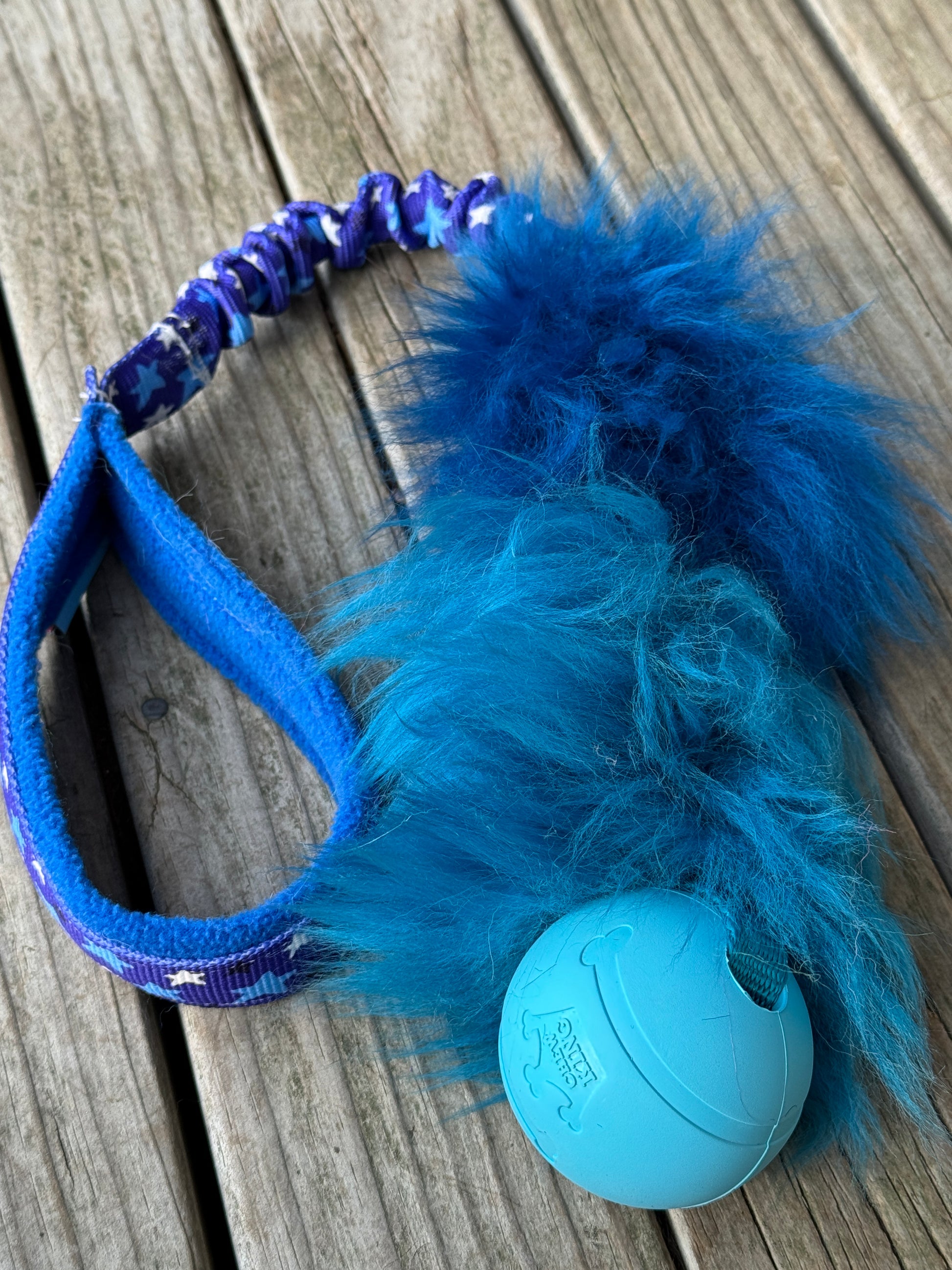 Every dog loves a good fluffy tug! This fluffy toy helps to develop a dog desire to play. It works well in dog sports like agility, but also in daily games. You can use it to interact and build a positive relationship. It is made of a 16 cm sheepskin bite area, bungee, and a polar fleece lined handle for your comfort. To add a little weight to our regular sheepskin Tugs a ball has been added. This makes the toy easier to throw and with a variety of ball choices you are sure to find something your dog will love. All the stitches are made with super strong thread.