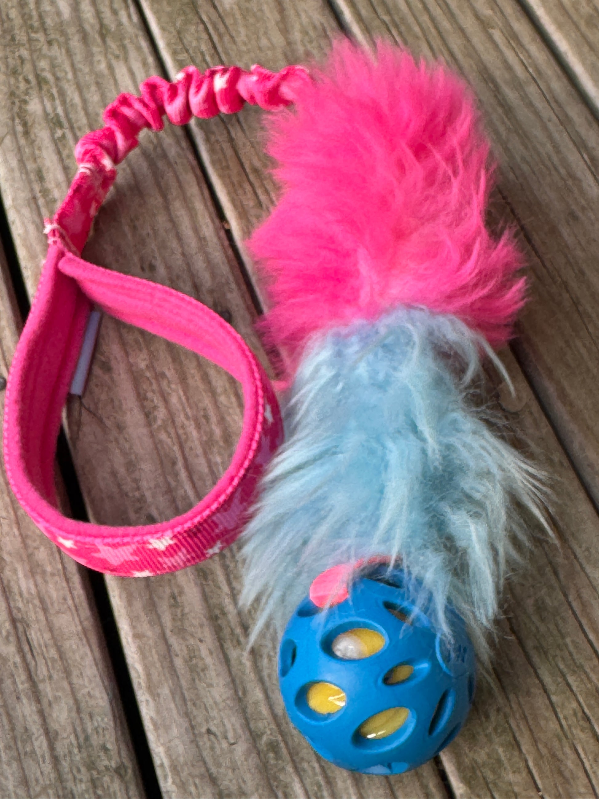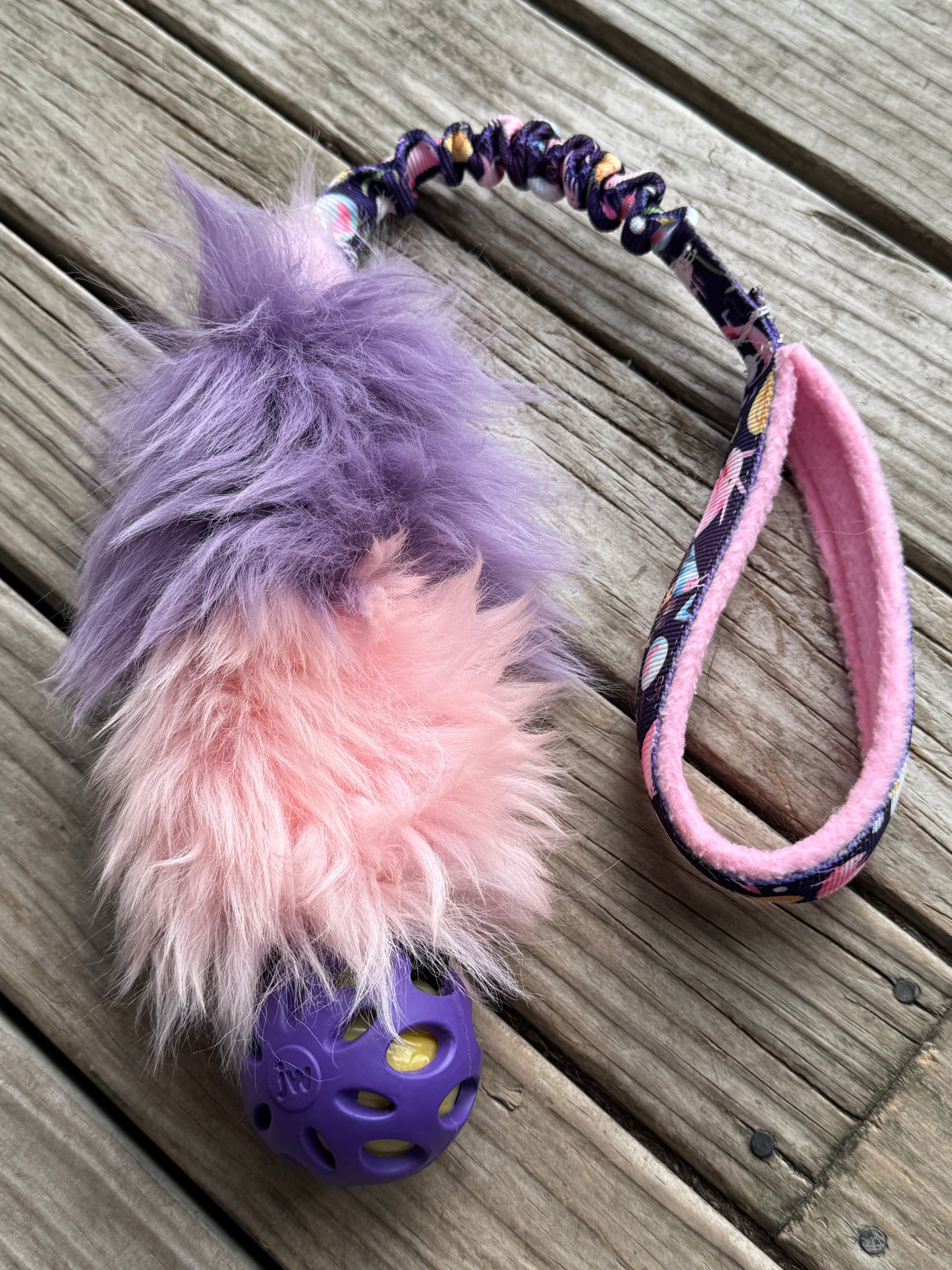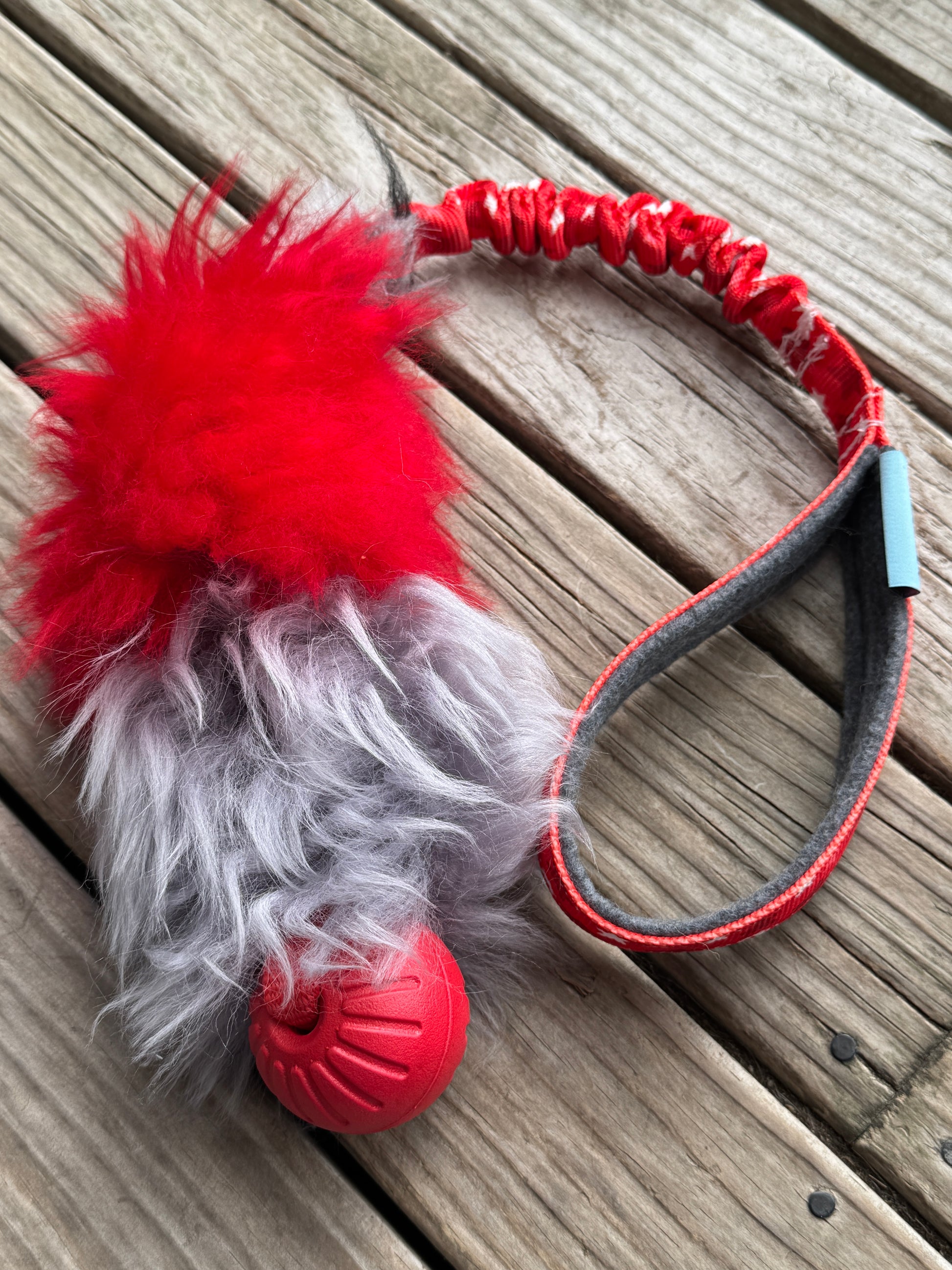 Every dog loves a good fluffy tug! This fluffy toy helps to develop a dog desire to play. It works well in dog sports like agility, but also in daily games. You can use it to interact and build a positive relationship. It is made of a 16 cm sheepskin bite area, bungee, and a polar fleece lined handle for your comfort. To add a little weight to our regular sheepskin Tugs a ball has been added. This makes the toy easier to throw and with a variety of ball choices you are sure to find something your dog will love. All the stitches are made with super strong thread.